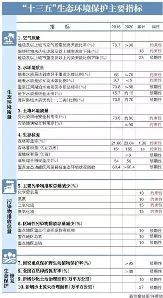 《规划》的另一个亮点是,环境质量首次写入规划约束性指标。《规划》中提出12项约束性指标。其中涉及环境质量的8项指标,是第一次进入五年规划的约束性指标。据介绍,《规划》提出12项约束性指标,包括地级及以上城市空气质量优良天数、细颗粒物未达标地级及以上城市浓度、地表水质量达到或好于Ⅲ类水体比例等。